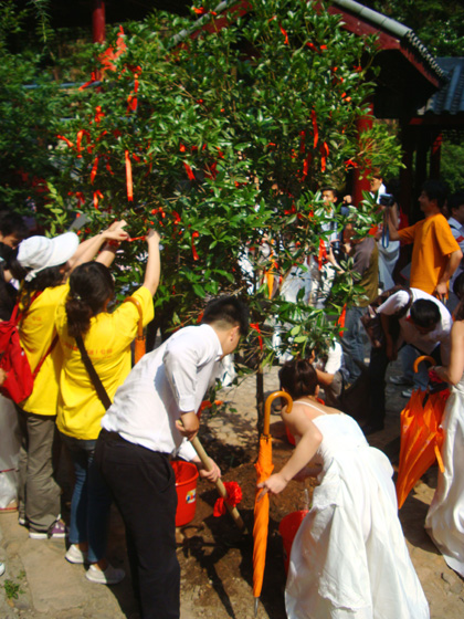 “百對新人、百年雙喜”大型婚慶活動于6月6日在古城臨安隆重舉行開幕典禮。來自長江三角洲的一百五十對新郎新娘,穿著潔白的婚紗、禮服相聚在花團(tuán)錦簇的臨安人民廣場,在這里舉行簡短而隆重的開幕典禮之后,液體空運(yùn)新人們乘坐十輛大巴,去臨安太湖源風(fēng)景區(qū)參加豐富多彩的婚慶活動,去親身體驗(yàn)姚明葉莉浪漫溫馨的婚紗之旅。150對新人在太湖源生態(tài)景區(qū)同心栽種一棵“百對新人百年雙喜”的愛情之樹,每一對新人在愛情樹上系上紅綢帶、并許下自己美好的心愿。