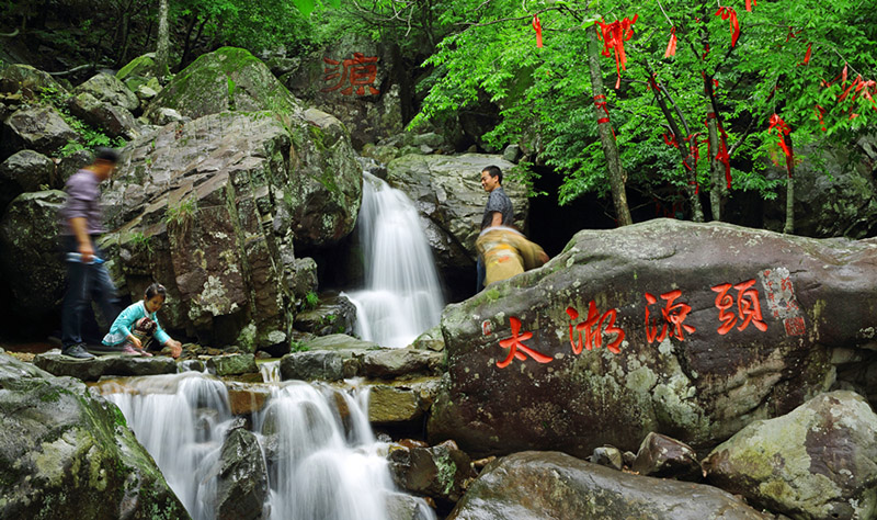 景區(qū)最幽深處便是太湖源泉,有巨石、溪灘、枯木、靈水。巨石成倒放的凹字形,源頭活水沁縫而出,因?yàn)殓姁?ài)玩木,平日里也尤其關(guān)注各樣的木頭,咬在巨石邊的枯木,不知該稱(chēng)作木抱石還是石抱木。太湖源頭活水靈動(dòng),我相信,只要找到信仰,總能盼到枯木逢春,朽樹(shù)生花,人生便是如此。