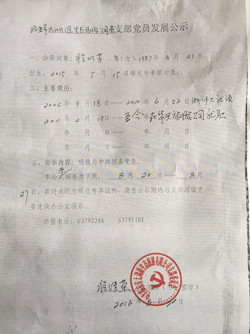 臨安市太湖源生態(tài)旅游公司黨支部黨員發(fā)展公示2016年08月23日
