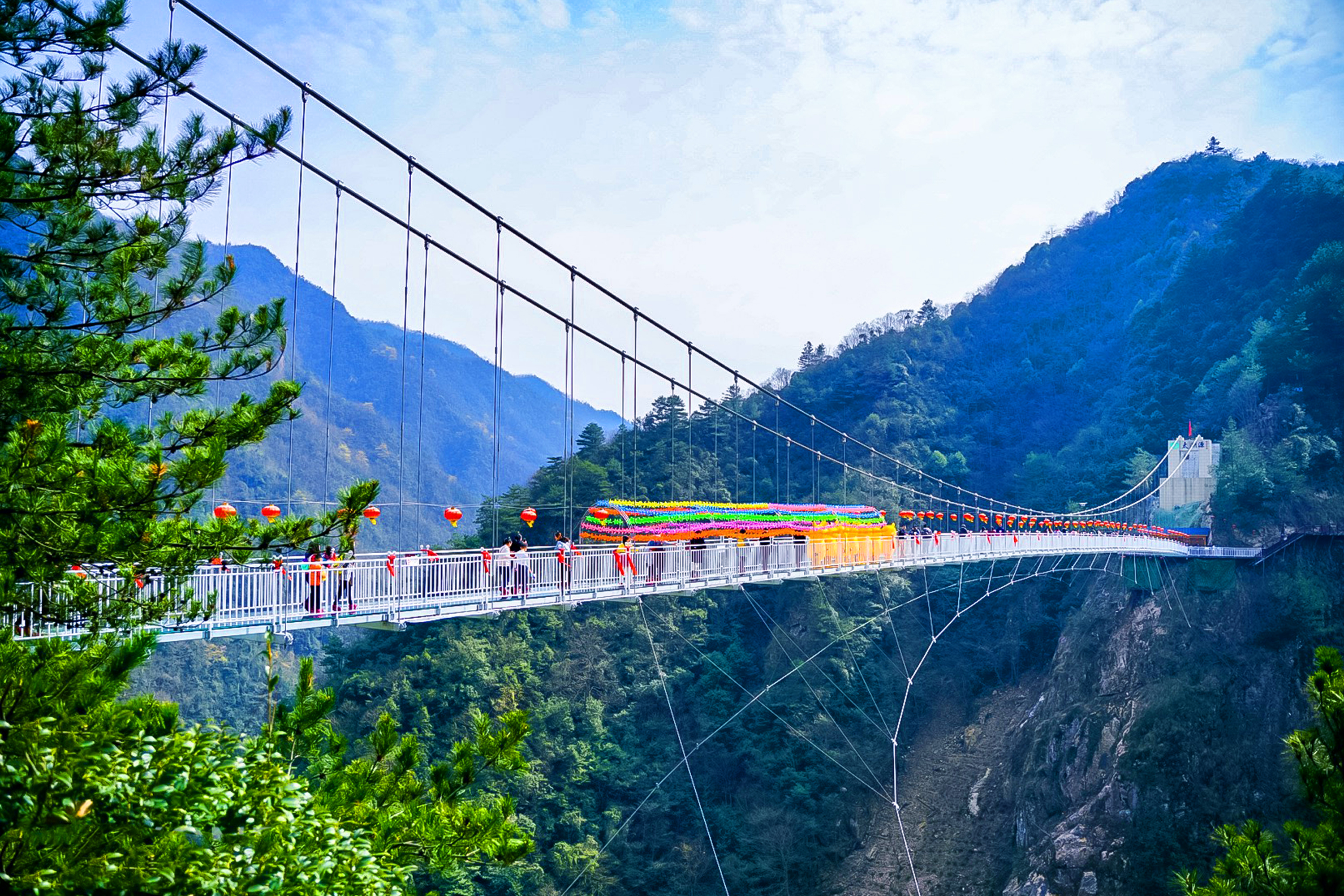 太湖源國家AAAA景區(qū)內(nèi)擁有杭城首座5D懸空玻璃吊橋,橫跨橋面258米,近60層樓高,驚險刺激程度堪稱華東之最。站在橋上心情無比澎湃,是英雄還是狗熊,走一遭便知。整個峽谷風(fēng)光一覽無余,與天空仿佛只有一尺距離,在橋上拍各種大片分分鐘稱霸朋友圈~